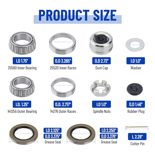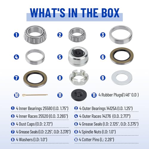 Complete Kit: 4x Inner bearings 25580(I.D. 1.75″)丨4x Inner races 25520丨4x Outer bearings 14125A(I.D. 1.25″)丨4x Outer races 25520丨8x Grease seals 22333TB丨4x Cotter pins丨4x Dust caps丨4x Rubber plugs丨4x Spindle nuts丨4x Washers