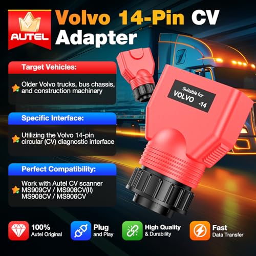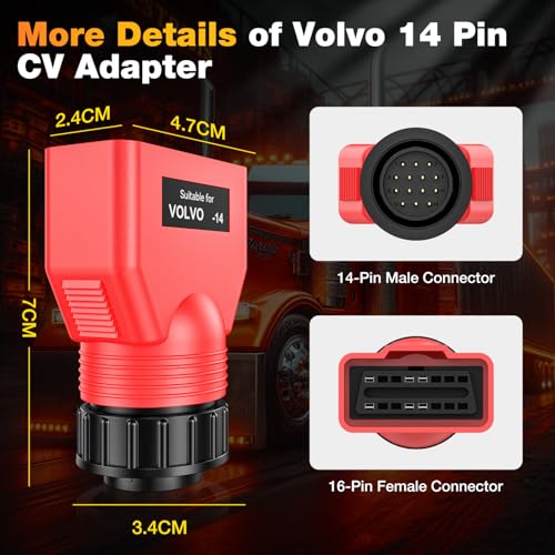✅【Work with Autel MaxiSYS CV Scanners】This V.olvo 14-pin adapter works seamlessly with Autel commercial vehicle diagnostic tools, including the Autel MaxiSYS MS909CV , MS908CV II, MS908CV, and MS906CV. It enables your Autel CV scanner to: Read/ clear DTCs, access Live data, Perform bidirectional test, injector coding and more. NOTE: Ensure your diagnostic tool has the latest “Truck/Bus” software installed (older versions may not support newer vehicle models).