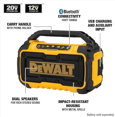 This Bluetooth speaker is jobsite tough and produces high-quality sound. Enhance your workday by streaming your favorite music or podcasts from your Bluetooth equipped mobile device from up to 100 ft. Away. You can also plug devices directly in with the auxiliary input. Charge your phone through the day with an integrated USB charging port. Stand your mobile phone in the slot of the built-in carry handle, or underneath. Enjoy rich stereo sound with extended bass from dual 3 in. speakers. Its rugged design includes a metal grille and impact-resistant housing. Power the jobsite Bluetooth speaker with DEWALT 12V MAX*, 20V MAX*, or FLEXVOLT batteries, all sold separately. Includes universal AC cord. Comes with 3-year limited warranty.
