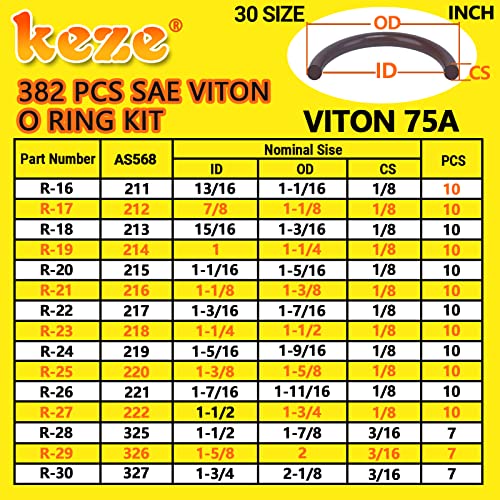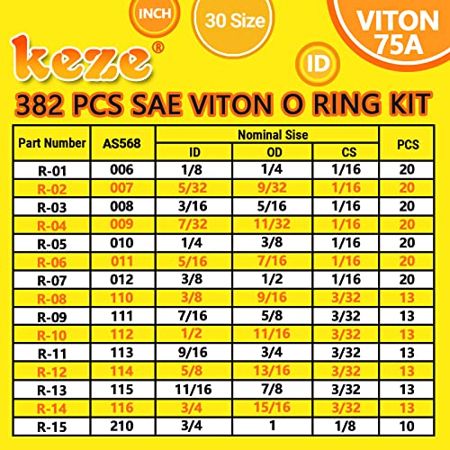 SAE SIZE:Assort viton o ring kit contains 30 size inch ID:1/8″, 5/32″, 3/16″, 7/32 “, 1/4″, 5/16″, 3/8″, 7/16″, 1/2″, 9/16”, 5/8 “, 11/16″, 3/4″, 13/16″, 7/8″, 15/16″, 1″,1-1/16″,1-1/8″,1-3/16″,1-1/4″,1-5/16″,1-3/8″,1-7/16″,1-1/2″,1-5/8″,1-3/4″X Section: 1/16″, 3/32″, 1/8” ,3/16 “meets standards defined by aerospace standard AS568a