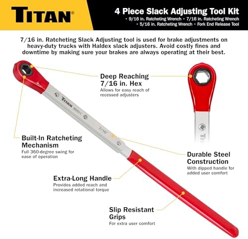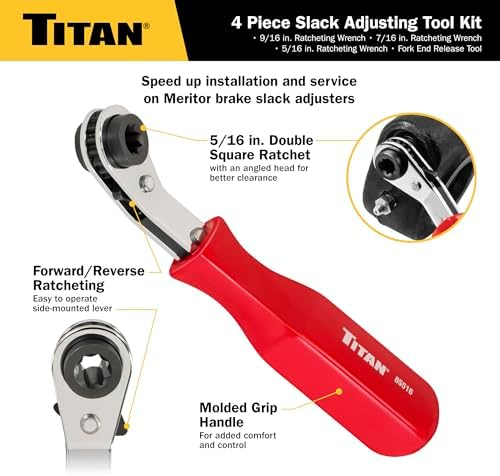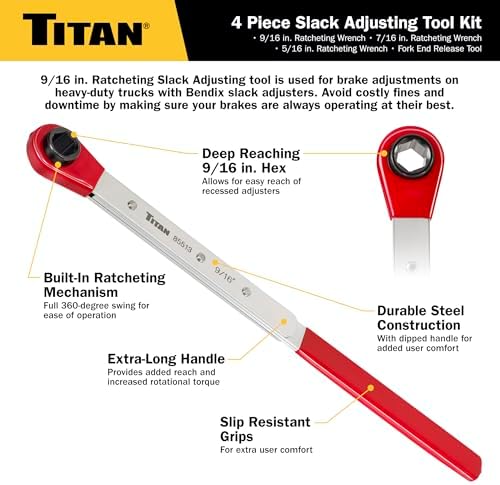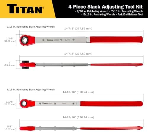 Titan 85569 4-Piece Slack Adjusting Tool and Wrench Kit contains (3) Slack Adjusting Wrenches – (1) 5/16-Inch, (1) XL 7/16-Inch, (1) XL 9/16-Inch, and (1) Slack Adjusting Tool. Use XL 7/16-Inch wrench to speed up installation on Haldex heavy-duty truck brake slack adjusters, use XL 9/16-Inch wrench on heavy-duty Bendix, and use 5/16-Inch wrench on Meritor. XL wrenches enables acces to recessed adjusters and 5/16-Inch wrench has an angled head to give additional clearance for hands. XL wrenches features built-in ratcheting mechanism with full 360-Degree swing. Fork-end release tool holds tensioner release button securely without prying or damaging. Made in Taiwan.