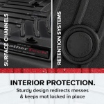A patented High-Density Tri-Extruded (HDTE) material allows for a rigid core for strength while offering surface friction to the carpet, as well as a tactile feel to the surface! Advanced surfacing creates channels that carry fluids and debris to a lower reservoir with further channeling to help minimize fluid movement while driving!